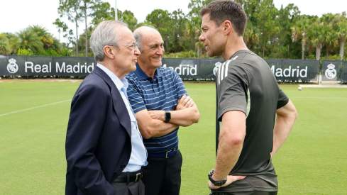 Florentino Pérez y José Martínez Sánchez 'Pirri', conversando con Xabi Alonso, durante un entrenamiento del Real Madrid el pasado verano en Estados Unidos, en pleno Mundial de Clubes.