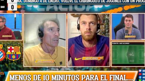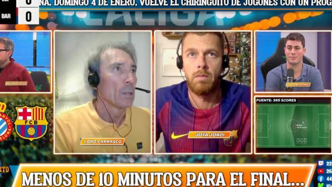 El tertuliano habitual de ‘El Chiringuito de Jugones’ comentó el partido en el canal de Twitch que tiene el espacio de Josep Pedrerol y enloqueció desproporcionadamente cuando el Barça se adelantó con la diana de Olmo, que definió por toda la escuadra de la portería defendida de Marko Dmitrovic. Tanto Jota como Lobo Carrasco celebraron el gol de su equipo como si se tratara de la final de la Champions e incluso el primero pudo realizar un corte de mangas, aunque no se puede asegurar, ante la partición de ‘su’ pantalla. “¡Vamos!”, también decía, mientras se besaba el escudo del Barça en la camiseta que lucía.