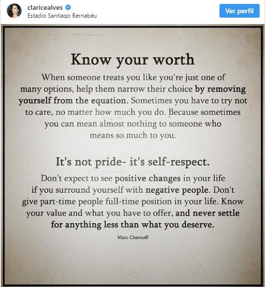 Clarice Alves, hizo una publicación en Instagram en lo que parecen ser unas palabras dedicadas a Solari