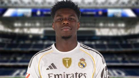 Aurélien Tchouaméni con la camiseta del Real Madrid y el Santiago Bernabéu.