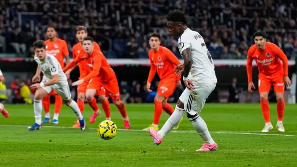 El Real Madrid es líder de la Liga, a la espera de lo que haga el Barcelona este lunes en Montilivi contra el Girona (21 horas), tras la goleada ante la Real Sociedad (4-1) en un partido en el que el equipo fue dirigido por el liderazgo de Vinicius Junior ante la ausencia de Kylian Mbappé, que no jugó ningún minuto tras los problemas en su rodilla izquierda que volvieron a relucir durante esta semana. El brasileño firmó un ‘doblete’ tras dos penaltis que buscó, provocó y transformó él mismo, consiguiendo llegar ya a los 10 goles y 11 asistencias esta temporada. El propio Vini, además, se encargó de mostrar quién le ha enseñado a tener mejor porcentaje de acierto desde los once metros.