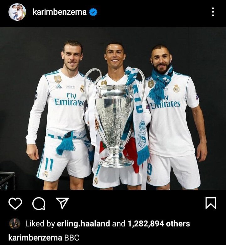 Varios medios internacionales han informado que el deseo del noruego es recalar en el Real Madrid. De hecho, esto no es una novedad y un aficionado madridista en 'Twitter' (@totalcristiano) ha publicado una foto donde podemos ver como Erling dio me gusta a la icónica foto de Benzema, Cristiano Ronaldo y Bale en la final de Cardiff posando con el trofeo de la Champions League.